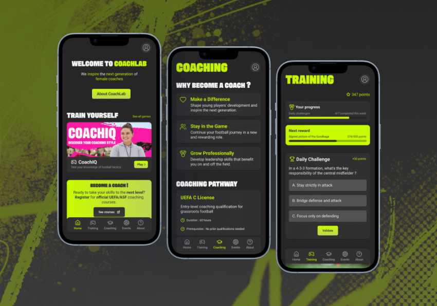 Coachlab est une campagne de communication visant à promouvoir le football féminin en Suisse et encourager davantage de femmes à devenir entraîneuses. Le projet s'axe autour d'une identité visuelle forte, d'une plateforme pour apprendre les bases de la tactique et du coaching de manière ludique, et des solutions physiques pour atteindre les futurs coaches au bord du terrain. L'objectif est de légitimiser les femmes dans le football afin de soutenir les vocations de celles qui souhaitent s'investir comme entraîneuses.