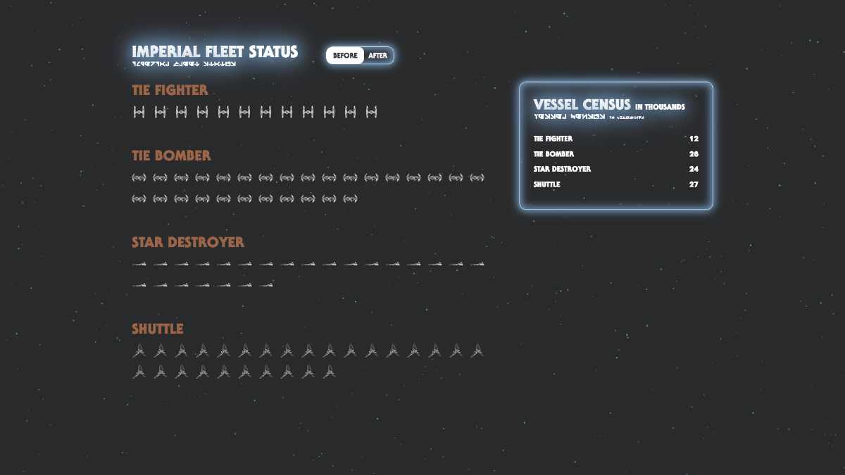 Le rapport annuel de l'empire est un projet d'expérimentation autour de la visualisation de données dans l'univers de Star Wars. Il montre les pertes subies ainsi que les personnages et espèces avec lesquelles traite l'empire. Ce projet se présente comme un rapport diégétique qui serait présenté au sein même de l'univers Star Wars.