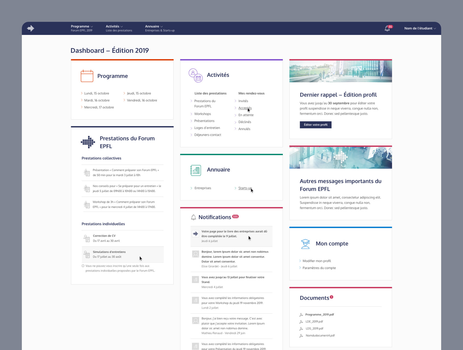 Le Forum EPFL est une plateforme professionnelle innovante conçue pour créer des connexions entre les étudiants de l'EPFL et les entreprises leaders du marché. Ce projet facilite les rencontres entre talents émergents et recruteurs, offrant aux étudiants des opportunités de stage, d'emploi et de mentoring. La plateforme propose une expérience utilisateur optimisée avec des fonctionnalités de matching professionnel, des profils détaillés et des outils de communication directe pour favoriser les échanges constructifs et les partenariats durables.